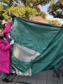 マンホールトイレは下水道管の上に設置し、テントをかぶせます。マンホールを持ち上げるのも一苦労でした。